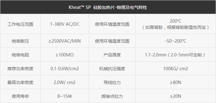 Kheat™ SP硅胶加热片是PA旗舰厅 公司研发生产的加热产品,硅橡胶具有良好的耐候性和抗老化性,作为加热片的表面绝缘材料可以有效防止了产品表面开裂及增强机械强度,大大延长了产品的使用寿命。可按设计要求定制。