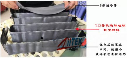 动力锂电池组液冷散热部分由液冷管和导热绝缘硅胶挤出材料组成。液冷管包括内部的冷却液,主要完成锂电池工作产生热量的散热,导热硅胶挤出材料主要完成电芯与液冷管之间的热传导,它的选择是动力锂电池热设计的重要考量因素,通常有以下几方面的要求:
