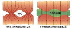 受限于机械加工精度,刚性接触面间会存有极细微的凹凸不平的空隙。上图示意了刚性接触面间热量传递的路径。众所周知,空气导热系数极低,接触面间的空隙会使得热量的传递变得困难。在界面间填充高导热柔性材料是降低接触热阻的有效方法。特殊场景中,导热界面材料它还需要同时具备绝缘、吸波功能。为了保证热量传递的通畅性,在电池包中,电池和冷板之间同样需要贴附导热界面材料。